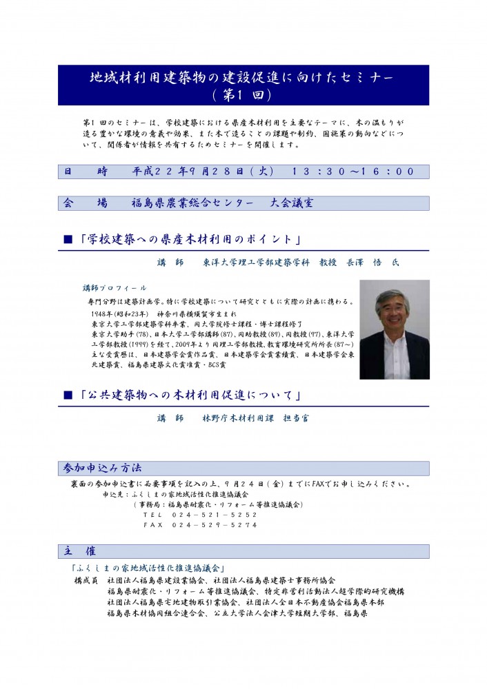 「公共建築物等における木材の利用の促進に関する法律」が10月1日施行されるのを前に、同法の理解を深め、県内での産業活性化につなげようとする研修の第1回セミナーが28日、郡山市の県農業総合センターで開かれた。主催はふくしまの家地域活性化推進協議会。全3回で今回は、木造化が可能な公共建築物の大部分を占める学校建築がテーマとなった。
